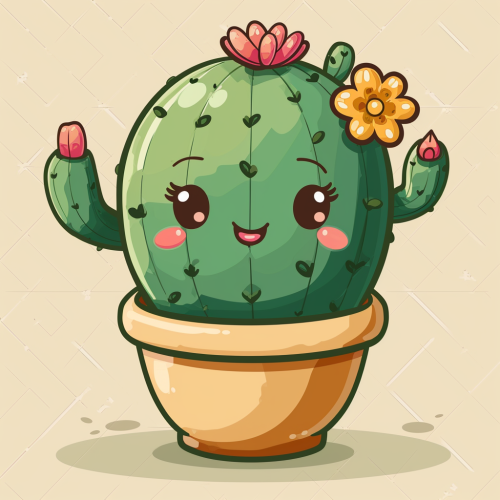 a kawaii cute cactus in a vector art cartoon style, flat color, cheerful and warm colors, white background, line art, flat design, high contrast, different facial expressions and flowers --v 6.0 --style raw --s 750