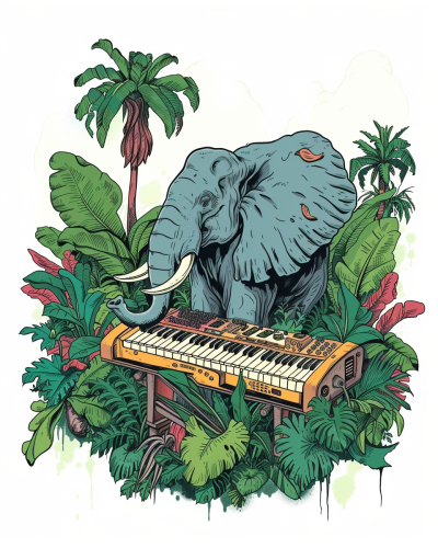 The elephant plays the synth keyboard in the jungle, white background,1970s, on the island, retro comic illustration, fairytale, wide-shot, vibrant colors, retro-futuristic --ar 4:5 --v 6.0
