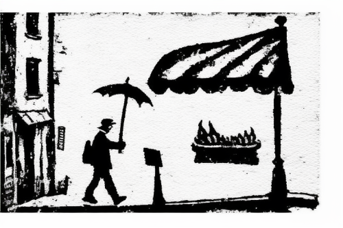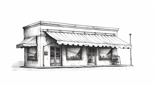 graffiti ink stamp effect of an italian icecream gelateria with an awning, black and white, white background, art by Banksy --style cursed --v 4 --ar 3:2 --upbeta --s 250