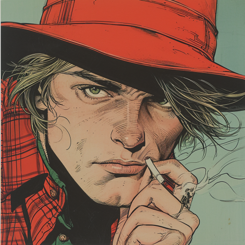 halftone print of a comic book front page about straight haired super-villain in his mid 20s with light-brown straight hair as a batman villain, baggy eyes, tired, looking from under his hat, his super-power is chain smoking cigarettes, he has gray-green eyes, wearing a colombia trucker hat and red plaid jacket, slender stature, comic-book, dark, gritty, Illustrated by Neal Adams as 80s comic book, in style of Neal Adams --v 6.0