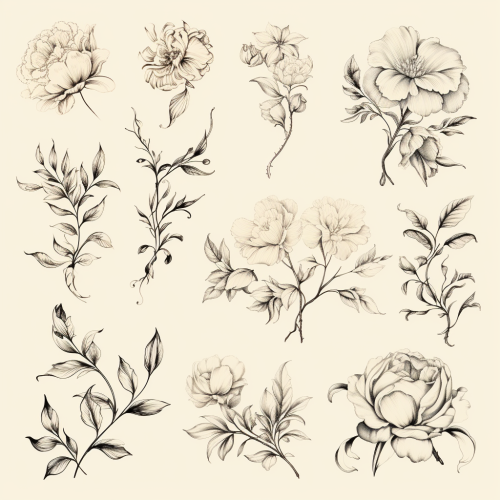 Create delicate and intricate line drawings, inspired by traditional old French floral designs. Focus on elegant, flowing lines and detailed, ornate patterns. Include elements such as roses, peonies, and fleur-de-lis, intertwined with subtle leafy vines and small blossoms. Emphasize a vintage, romantic aesthetic with a touch of sophistication. The drawings should be suitable for accentuating and enhancing a design that already incorporates these classic French floral motifs. Aim for a harmonious blend that respects the original style while adding a fresh, artistic touch.