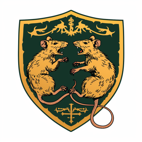 A royal seal for a fantasy kingdom. The sigil is two rat fighting and biting each other, on a shield. Hinterlands Green, gold, and crimson colors. Simple Design. Bold clean lines. White Background --v 6.0