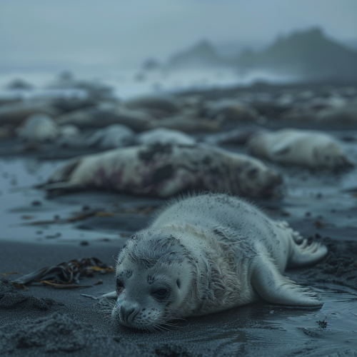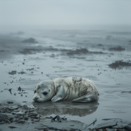 An atmospheric photograph of a small, barely alive seal pup lying on a desolate, cold beach; its fur wet and matted, eyes weakly open, struggling to breathe. Surrounding the pup, faint shadows of other seals create a somber atmosphere. Background is a foggy, mist-filled seashore, with cold waves crashing, sand scattered with debris. Soft, cold natural light from a cloudy sky highlights the seal’s fragile form, subtle reflections of the water add a chilling effect, muted, cold tones, hdr, cinematic realism, ultra-wide shot --v 6.0