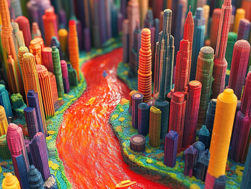A photo of a 3D model viewed from above, depicting a city made entirely of multicolored plastic. The model features tall towers and a red river flowing through the center of the city, ultra HD, 4K --ar 4:3