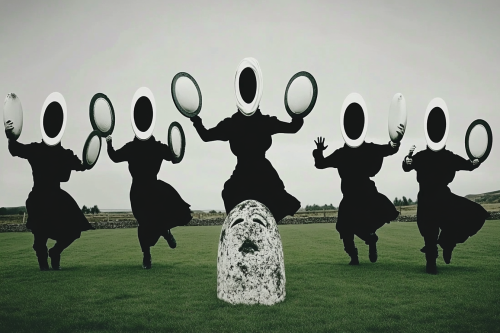 A still image from a 1999 home tape of a group of people using white rocks to hit a menhir on the isle of lewis scotland. noisy Videotape VHS quality. camcorder video tape, old camera phone style. bad quality. Scene from a horror bergman film with A sculpture of a pagan harvest folk - horror audio - visual eperiment at a menhir made out of scientific equipment, Tv crew, plaster sheep, nuclear fallout, whale body parts, tony robinson, dayglo plastic tarp, white wear, dirty pipes, tar, oil, Construction lights, neon high - vis clothing, --chaos 99 --v 6.1 --iw 2 --ar 3:2