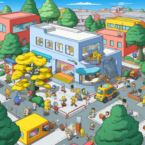Generate an AI artwork depicting a charming scene of a Japanese preschool, capturing the essence of joyful learning, vibrant classrooms, and the unique cultural elements that define early education in Japan in simpsons style