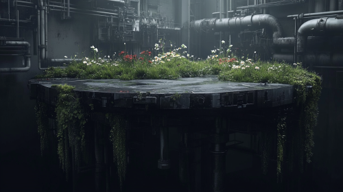 a big free-standing platform in a dark cyborg industrial complex. There are some flowers and a patch of grass on the top but pipes, darkeness, and depth below it. Photorealistic, 8k. --ar 16:9