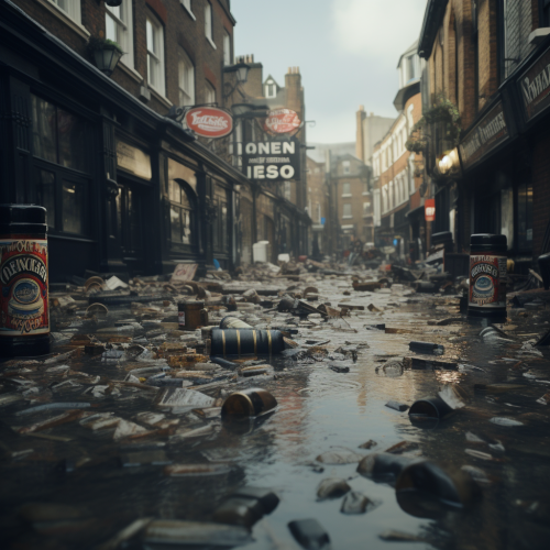 London beer flood, scattered floating human casualty , ultra realistic, super color graded, 8k