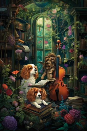 well dressed "Cavalier King Charles Spaniel" Dogs with saxophones in a flowery music library room in the deep sea, light from the downstairs, highly detailed, cyberpunk, graphically illustrated, oil painted, award winning, by Yuko Higuchi, neo tokyo, music tones, --ar 2:3