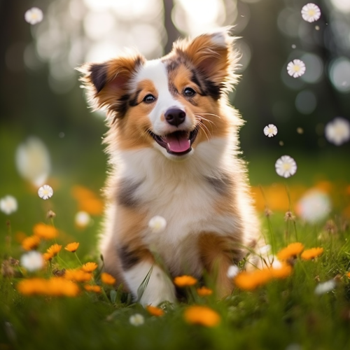corgi mixed with a little australian sheperd orange with white spots and flat ears in a field of dandelions
