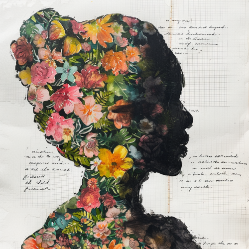 A minimalist and unusual illustration depicting a woman's half-left portrait, with flowers adorning her head, rolling her eyes to the lower right, --sref 2863834635