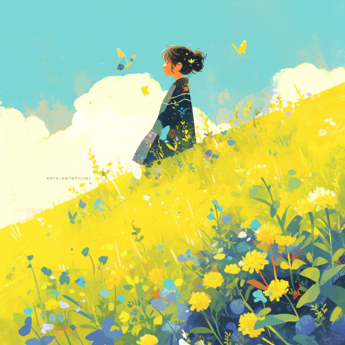 long thick blades of grass with sunshine glimmering through, small robot is walking through the grass::1 , butterflies, swallows, dandelion seeds, dandelions, green and yellow colors, word "ANTORINI"::1 --ar 1:1 --stylize 500 --niji 6