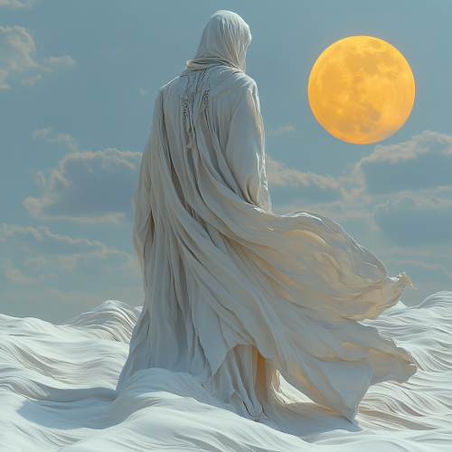 full body portrait of a person standing in a white desert, in a flowing white hooded robe, face hidden, robe texture is waves of white sand, 32k, AO, redshift rendered in Maya, photorealistic, detailed shadows, Accent Lighting, mood lighting, Ray Tracing Global Illumination, Ray Tracing Reflections, Dynamic lighting, tone mapping, Ray Tracing Ambient Occlusion, anti-aliasing, Realistic shading, volumetric lighting, golden ratio, depth of field, coherent design, ornate details, blue sky, yellow sun, music notes streaming forth from the person to the sun --s 750
