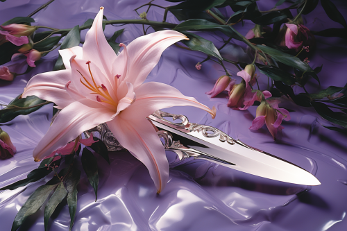 1980 airbrushed poster of a knife next to a lily, futuristic background, metallic, grayish and lilac colors --ar 3:2 --s 250 --v 5.2