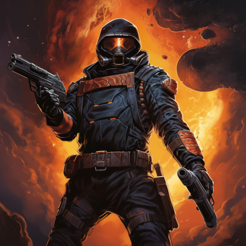 a man in a black astronaut suit with orange highlights, holding a Tommy gun, 80s dark fantasy cover art style