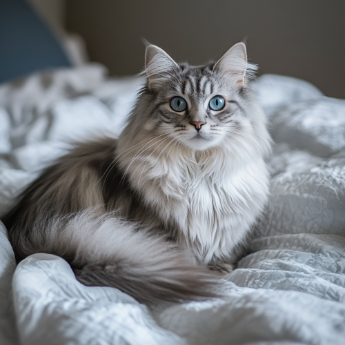 Beautiful calm white cat sitting surrounded by small white fluffy feathers, white feathers flying on the background, light purple background --ar 16:9