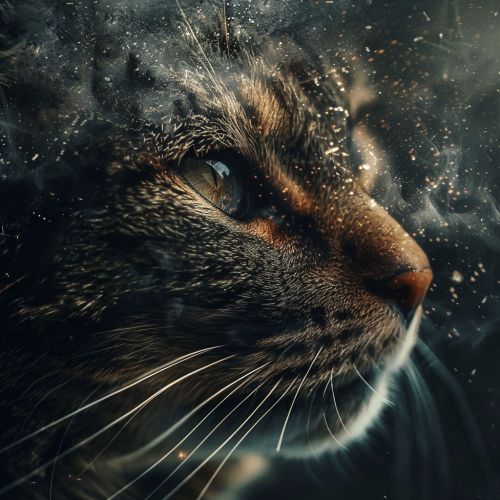 Artistic style painting with splashes and brushstrokes and textured background light gray fluffy tabby cat with Christmas wreath and garland with glowing lights
