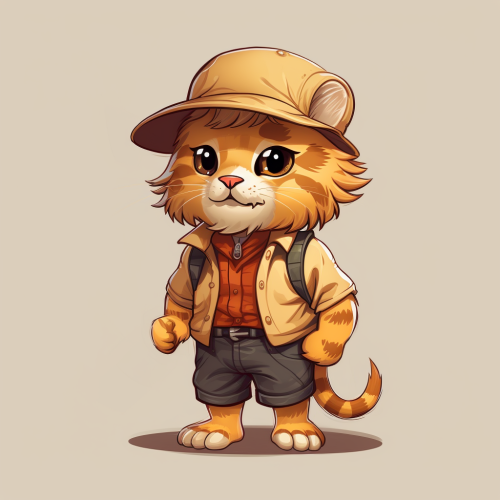 fluffy orange cartoon cat with a hat and matching button up shirt. Full body image