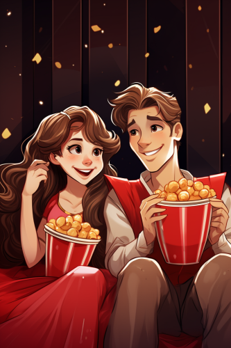 a cheerful cute princess in a simple red dress and crown and boy in Red shirt sit in the cinema and eats popcorn 2d --ar 2:3 --v 5.2
