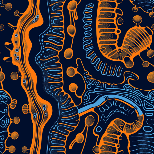 mutant hydnellum peckii tardigrades, ferrofluid pattern cellular blobs, futuristic circuit boards, blue and orange colorized line art, 1950's sci-fi horror comic, 1950's Mad magazine, scanning electron microscopy, simple black and white line art colorized blue and orange, --tile --v 6.0