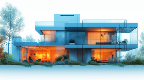 The work of art is a digital illustration that uses vector art and minimalism to create a complex and intriguing design. The illustration shows a blue silhouette of a house on a white background, with a green line representing the fourth dimension. The illustration uses vector shapes and lines to create smooth and straight outlines of the house, as well as minimal colors and elements to create a striking contrast and balance. The illustration conveys a sense of geometry, logic, and creativity, as well as the challenge and possibility of visualizing a house in four dimensions. The work of art is a fascinating and modern example of vector art and minimalism. --ar 16:9 --s 1000 --v 6.0