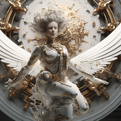 flying cybernetic cherub angel, marble white, metallic gold details, hyperdetailed, marble carved statue, weaponized, psychedelic, abstract, masterpiece, dynamic camera angle, dynamic perspective, 16mm, cinematic light, octane render, cinematic, opulent, premium look, mythological styles, balanced