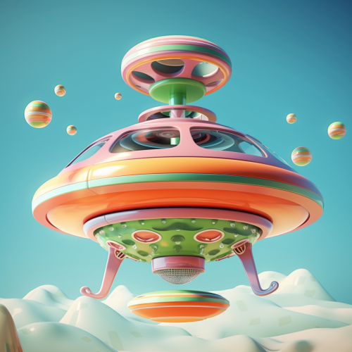 a flying saucer in the shape of a 3D triangle, flying in the distance in a soft blue light sky with soft grey clouds. Vintage style illustration 70's style with warm color pallette, in the stylings of H.R. Giger art 5
