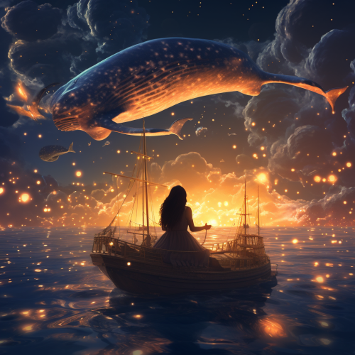 3 whales flying around night sky and a girl sitting on the biggest whale, stars and planets filled sky, digital art behance, golden sunset, baroque art style