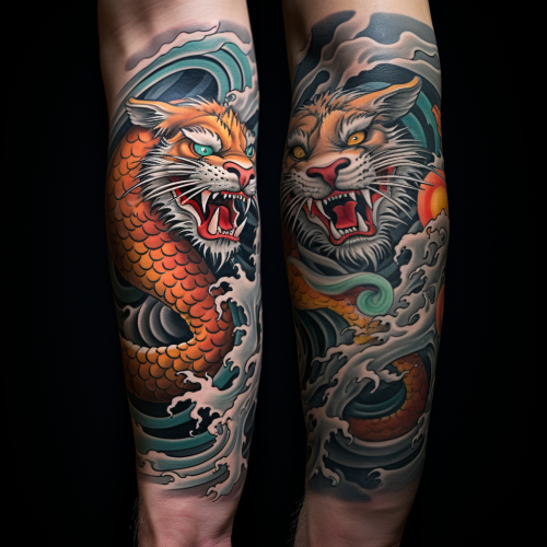 create realistic tattoo design of angry biomechanical tiger on arm. Black and grey color.
