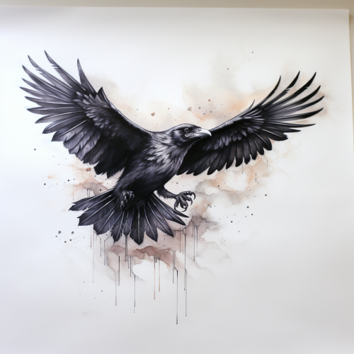 flying raven from side, one big wing next to body, looking up, template for tattoo forearm, sketch marker style, simple color --ar 20:30