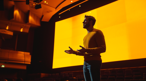 a man wearing a sweater and jeans lecturing in a stage with a yellow digital huge screen on a massive tech conference, cinematic lighting, ultra detailed, DOF, golden colours --ar 16:9 --v 6.0