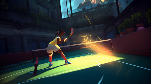 Create a vivid, action-packed scene of a tennis player rapidly covering the court in a high-speed, Flash-like motion effect. Show the player moving across the baseline, rushing to the net, and reaching side-to-side, with trails of light following their movements to emphasize speed and agility. The player’s form should be clear in each motion, capturing the stance and footwork in each position on the court. Include a realistic tennis court with visible netting, accurate court lines, and a slightly blurred background to convey intense motion. Use high-energy colors like electric blue, white, and neon to create a futuristic, powerful vibe, capturing the intensity and anticipation of competitive play. --v 5.0 --ar 16:9