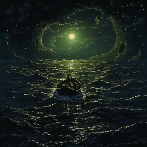 dark malefic ocean waves, dark fog looming over the ocean, sailing boat navigating into it, panoramic view