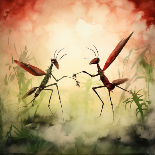 mantis boxing, funny and cute, fighting, foggy morning, backlighting, dark red and green background, meadow, Tradition Chinese Ink Painting