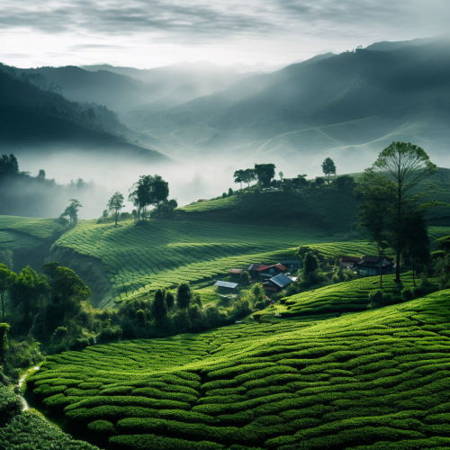 A table and a patio chair in a beautiful garden full of life in the style of studio ghibli. Natural light. There is tea and desserts. Totoro is hiding behind a tree. --ar 16:9 --s 500