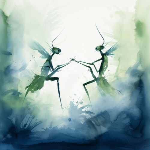 mantis boxing, funny and cute, fighting, foggy morning, backlighting, dark blue-green background, meadow, Tradition Chinese Ink Painting
