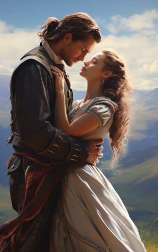 photorealistic, detailed, fantasy lighting for a book cover: outside in bright daylight, historical couple from 1746, Scottish Highlands in the background. He's strikingly handsome, rugged and muscular, wearing a kilt, he looks concerned; he’s trying to help her; she's beautiful and wearing a white wedding gown. --ar 5:8