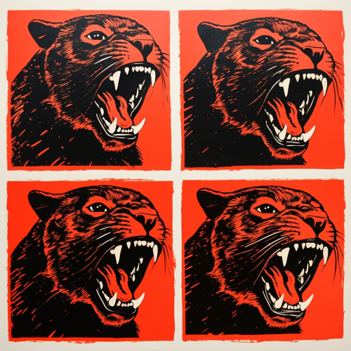 black panther clawing and roaring on red background expressionist aesthetic minimal modern linocut print, 4 panes - - ar 15:15 - - c 11
