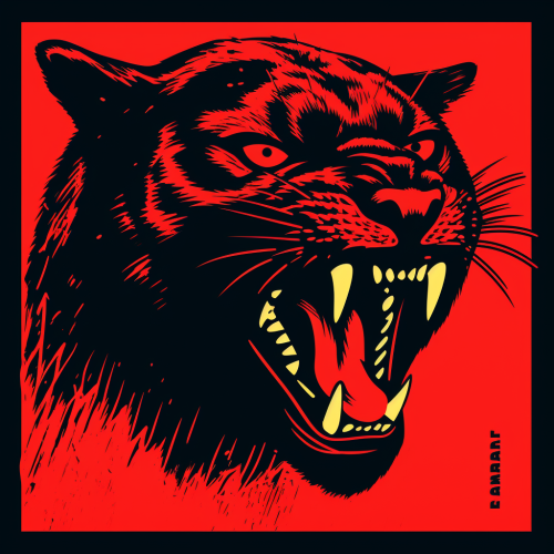 stamp_design squared_vector_solid_color_simplistic black bacground in the midle black panther clawing, roaring, vibrant red background, expressionist aesthetic, minimal, modern, linocut print