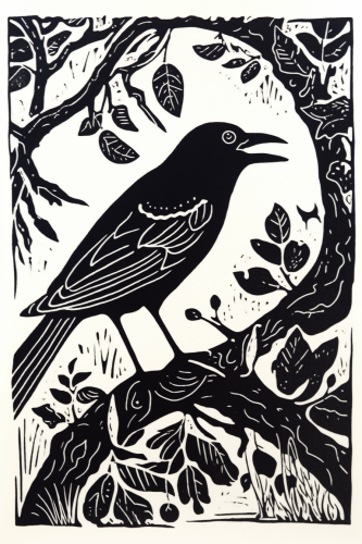 simple black and white linocut print of a crow sitting on a branch and a stag beetle a leaf, --ar 2:3 --v 5.0