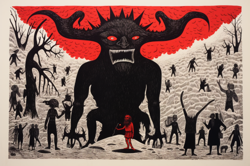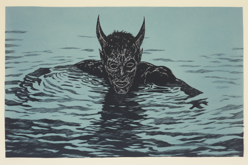Linocut print of a devil made of water, folkhorror --ar 3:2 --s 50