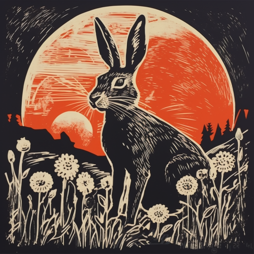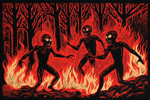 Linocut print of 3 devils dancing in a forest fire, folk horror --ar 3:2 --s 50