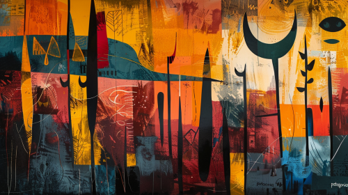 Emilio Pettoruti style, "la patagonia", abstract orange palette colors linocut, print style, woodblock print style, express creativity, colorful --s 250 --ar 16:9 --v 6.0