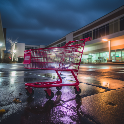Woman in store buying dog food in the pet aisle. theres horse feed in the cart. In the cart is horse feed. Behind her, there are some shelves displaying dog food tools in the style of a home improvement store. A banner reads "TRACTOR", suggesting professional photography and a cinematic style, as if inside a Daddario uniform store. The scene features bright lights, depth of field, and film grain. --ar 16:9