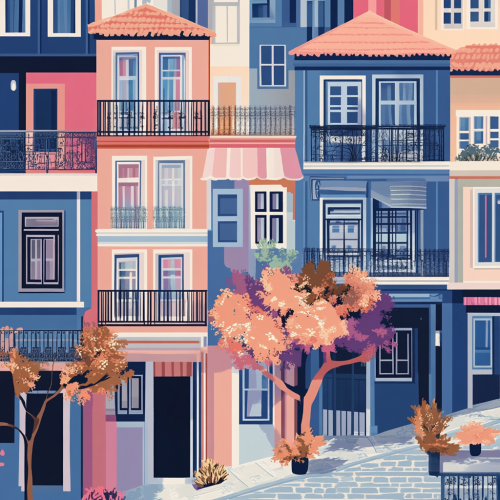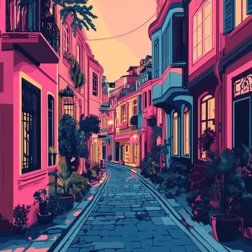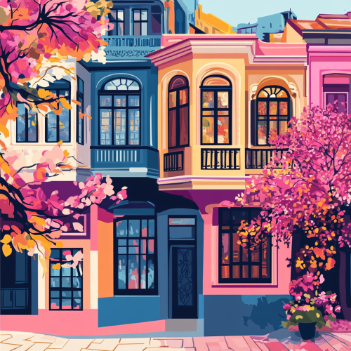 Create a vibrant,illustrative, high-resolution wallpaper about Karakoy streets, with bright and lively colors such as pink,dark blue, and sepia.The design should feature traditional turkish elements like windows, clothes, and patterns. The colors should pop and contrast beautifully with black text, making it visually striking. Add a sense of depth and dimension with soft gradients and shadows, giving the wallpaper a modern, touch.The art style should balance between traditional and contemporary Turkish aesthetics, with a harmonious yet bold design.-- ar 3:2 --v 6.1