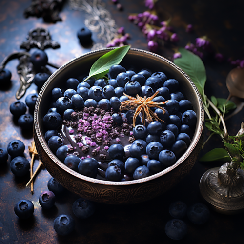 photoreallistic Breakfast: Acai bowl topped with indigo-colored berries (blueberries, blackberries). --s 250