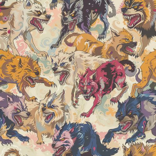 A whimsical, colorful wallpaper featuring an array of werewolves, each with its own unique design, spaced apart to create a playful and engaging scene. The werewolves should be depicted in a variety of vibrant colors, with exaggerated, cartoonish features to enhance the whimsical nature of the design. Each werewolf should have distinct expressions, colors, and textures, set against a background that complements the playful theme. The overall effect should be lively and engaging, perfect for a fun and imaginative wallpaper. --v 6.0
