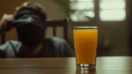 cinematic scene, extreme long shot, front view, man blindfold with a black handkerchief in front of a table, a glass with orange juice on the table, focus on the glass --ar 16:9 --v 6.0 --s 50 --style raw