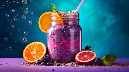 Detox smoothie and Chia Pudding Jar , Vibrant Single Color Background, Food Photography --ar 16:9