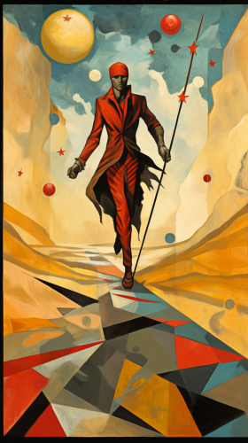 colored Pencil, very detailed, dinamic colors, Two Of Wands from a Tarot Deck, fantasy elements --ar 897:1497